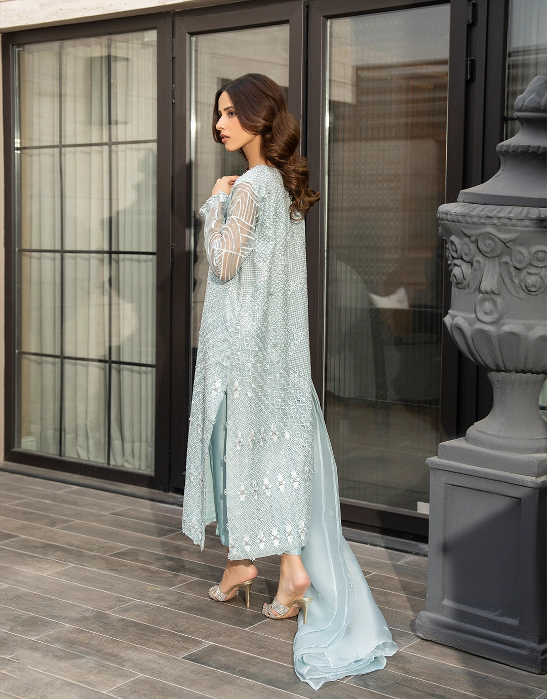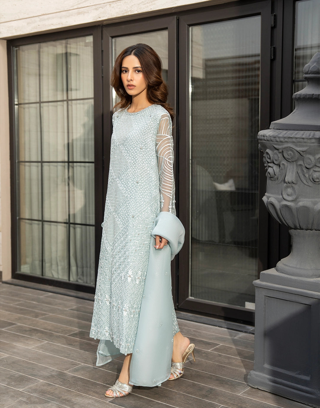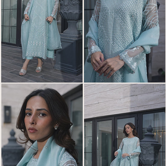 This is an elegant three-piece outfit in a beautiful light blue color. The organza shirt is heavily embellished with embroidery and all hand-worked detailing covering the full front and back, and is paired with sophisticated silk pants. The long, flowing kameez silhouette and the sheer, full-sleeved design, along with the detailed craftsmanship, make it perfect for formal occasions.
