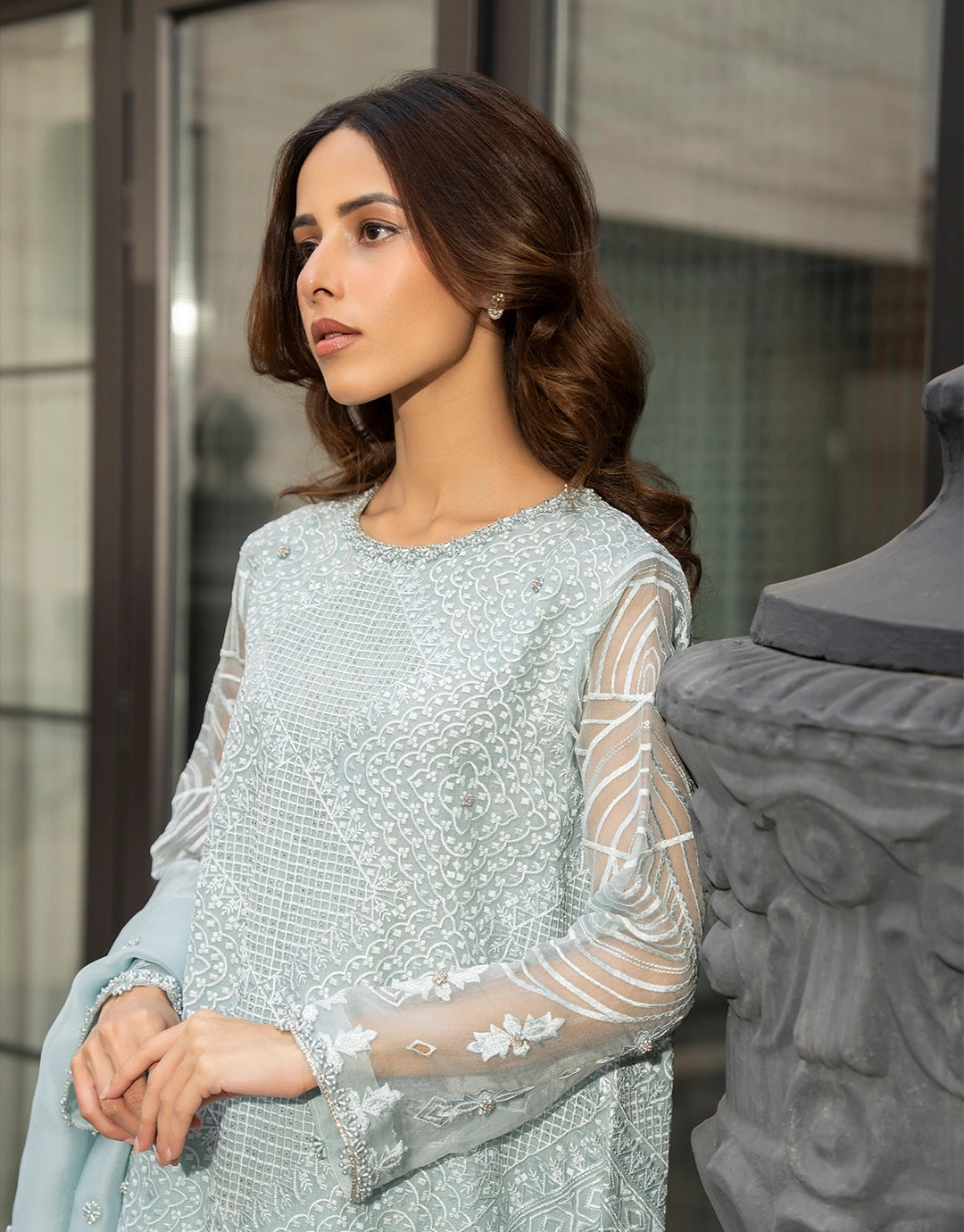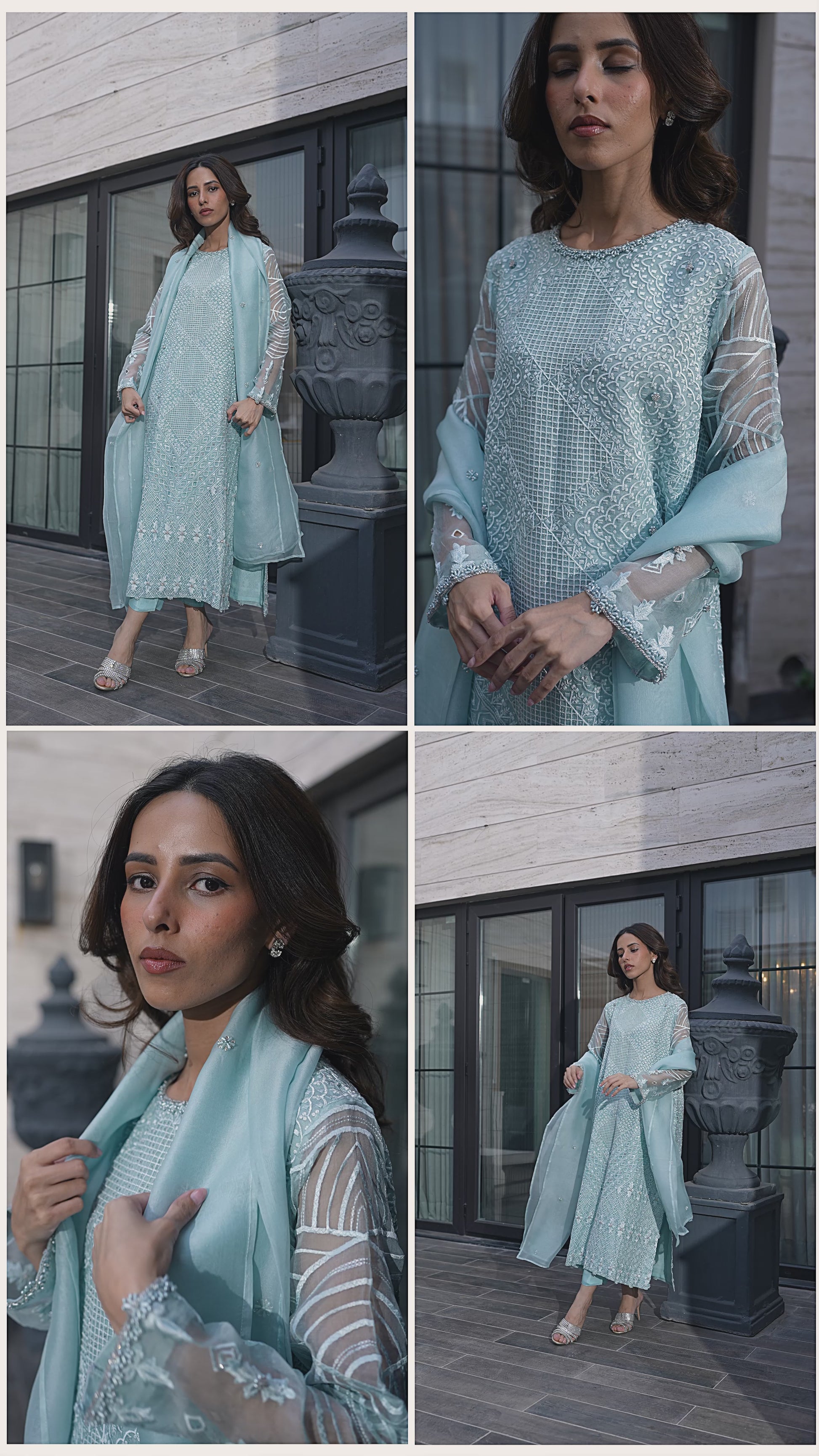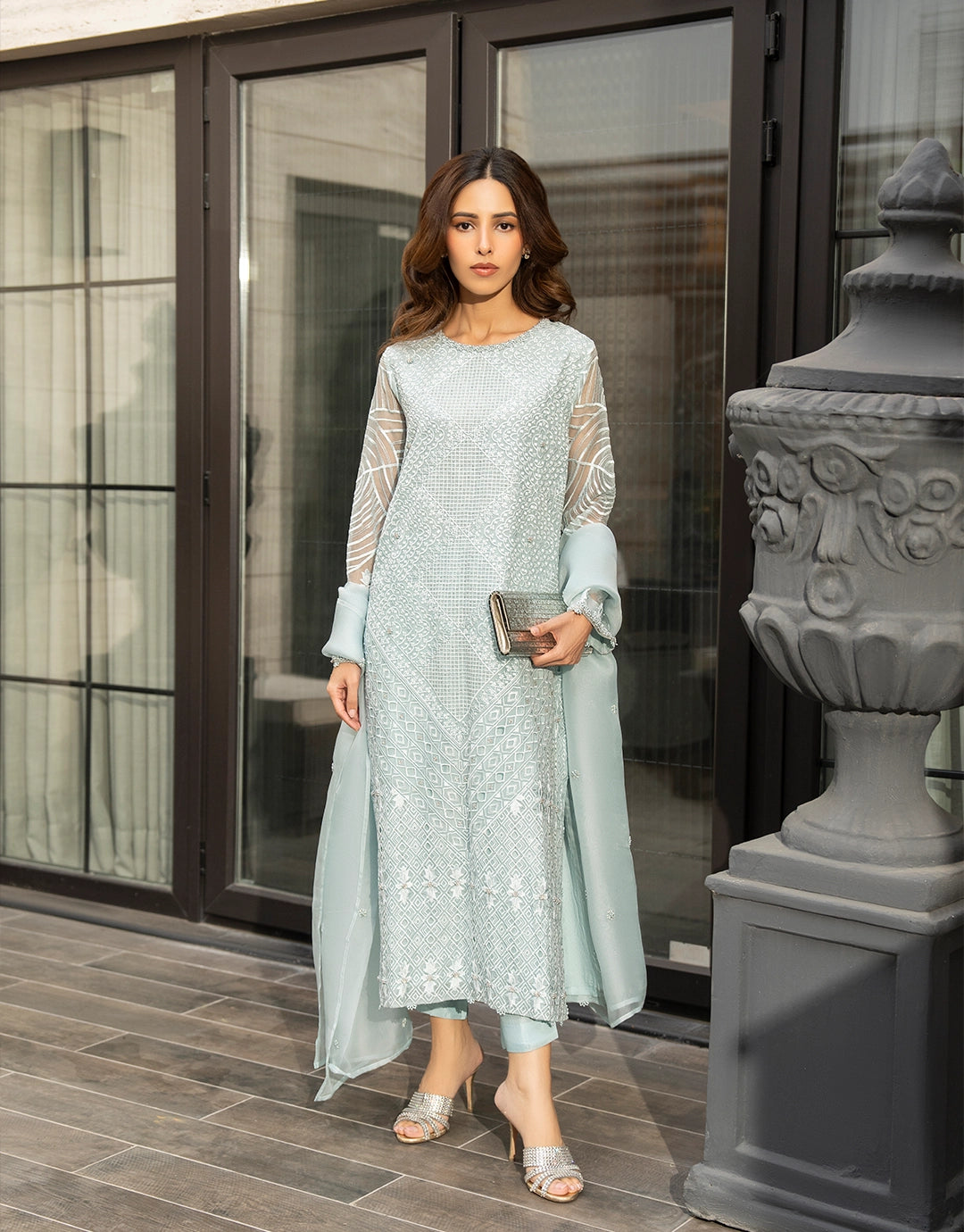This is an elegant three-piece outfit in a beautiful light blue color. The organza shirt is heavily embellished with embroidery and all hand-worked detailing covering the full front and back, and is paired with sophisticated silk pants. The long, flowing kameez silhouette and the sheer, full-sleeved design, along with the detailed craftsmanship, make it perfect for formal occasions.