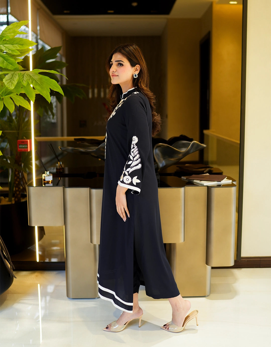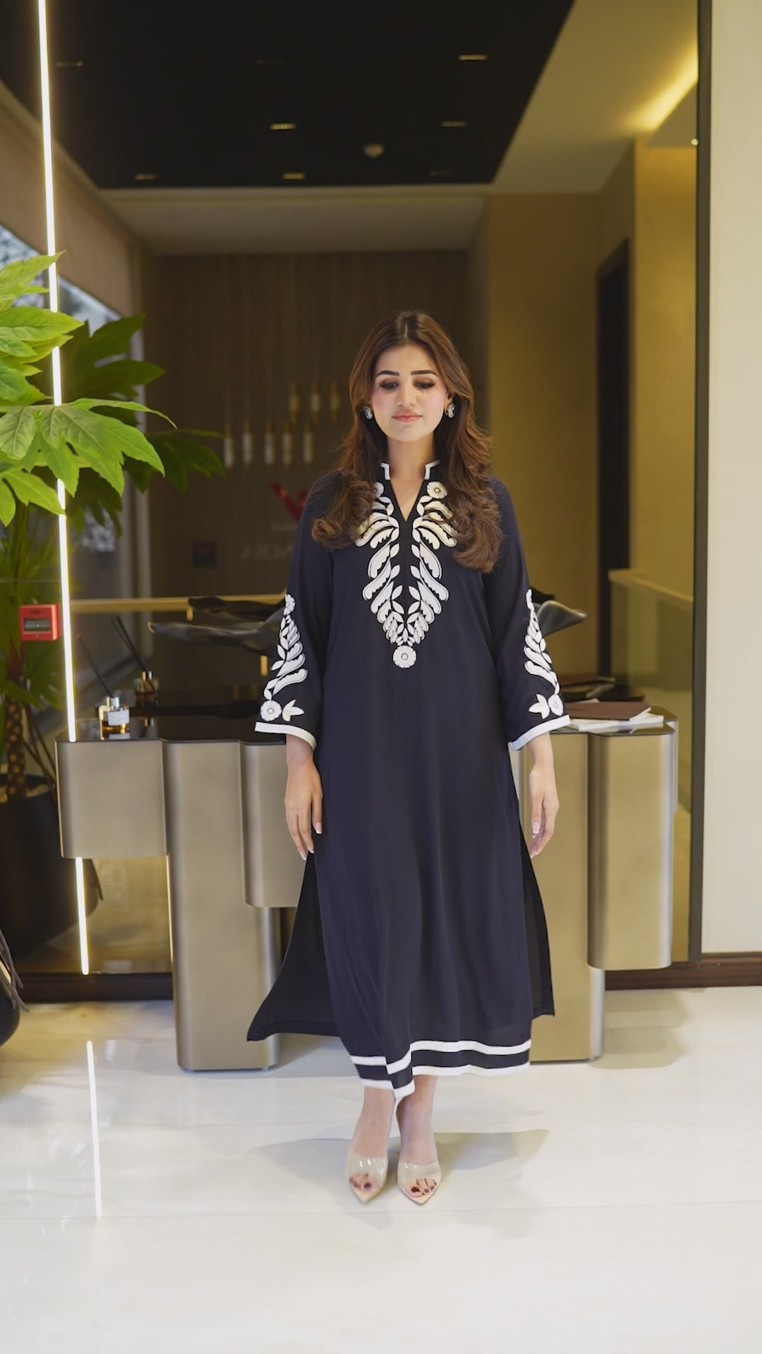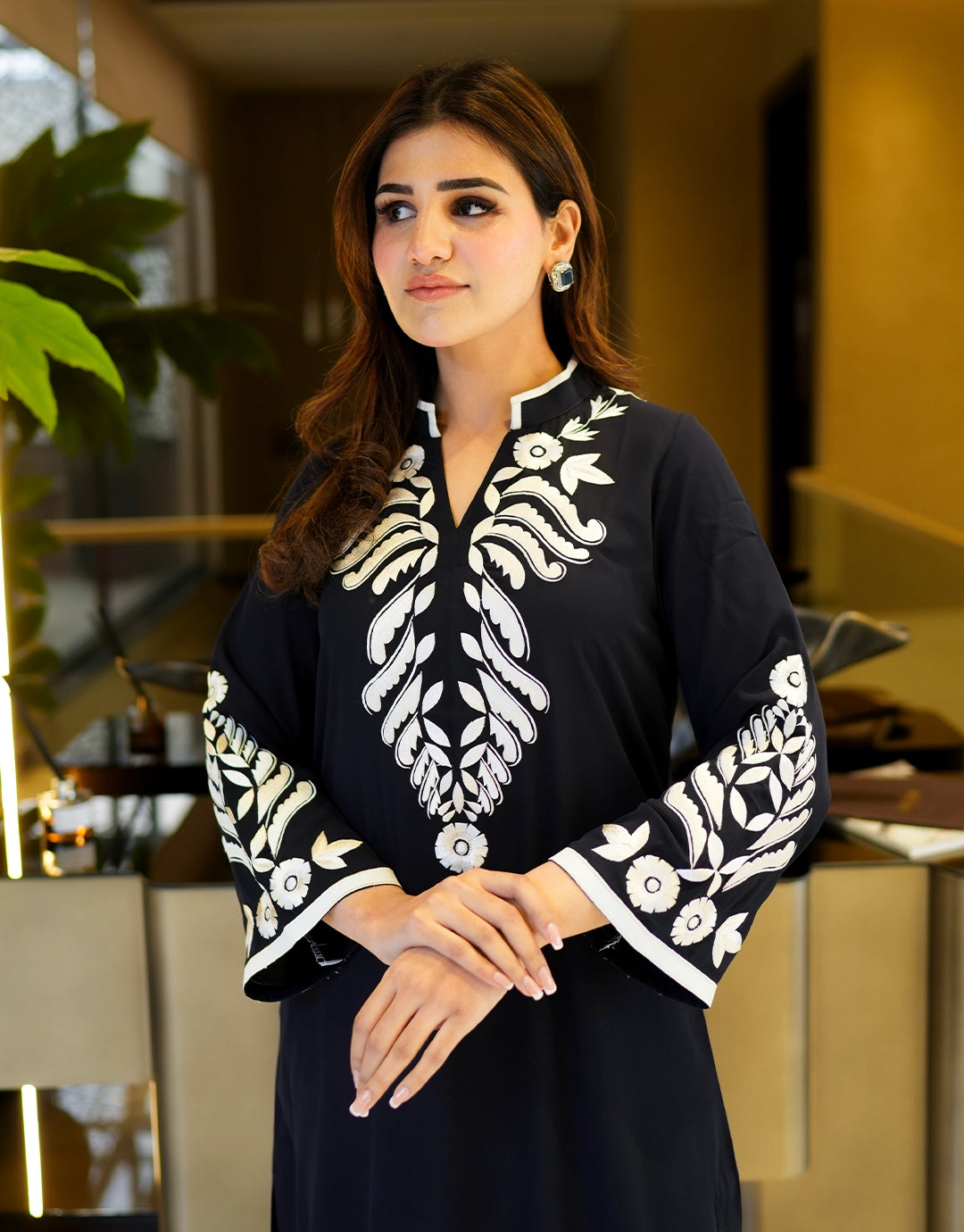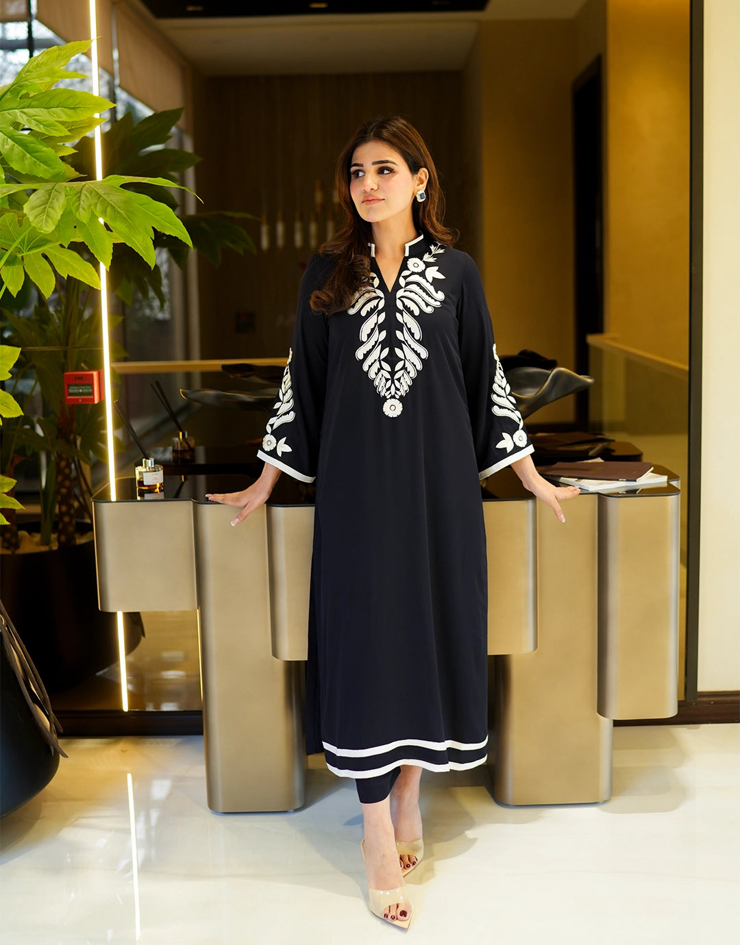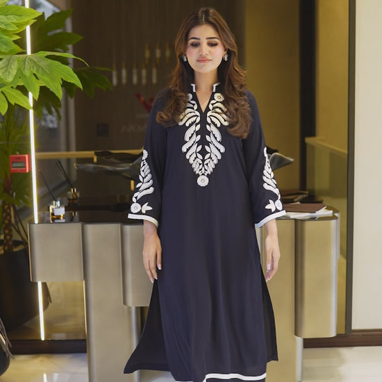 This striking 2-piece set is defined by its bold, high-quality white embroidery that frames the neckline & sleeves. The shirt features a clean, straight-cut design, paired with matching trousers. The whole outfit is made from premium matte twill, offering a breathable and comfortable feel.