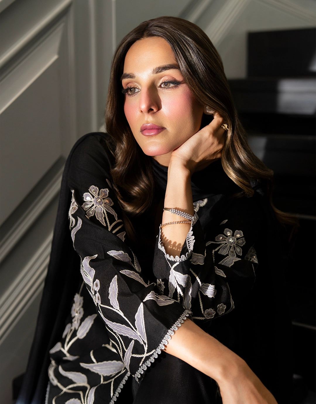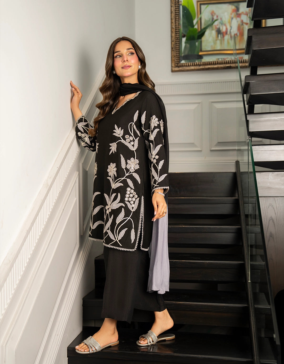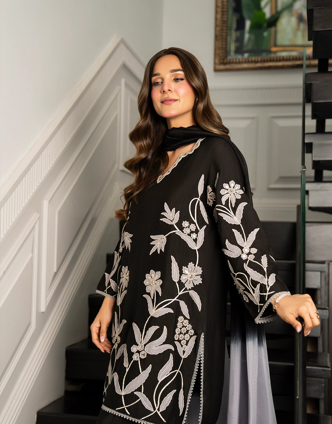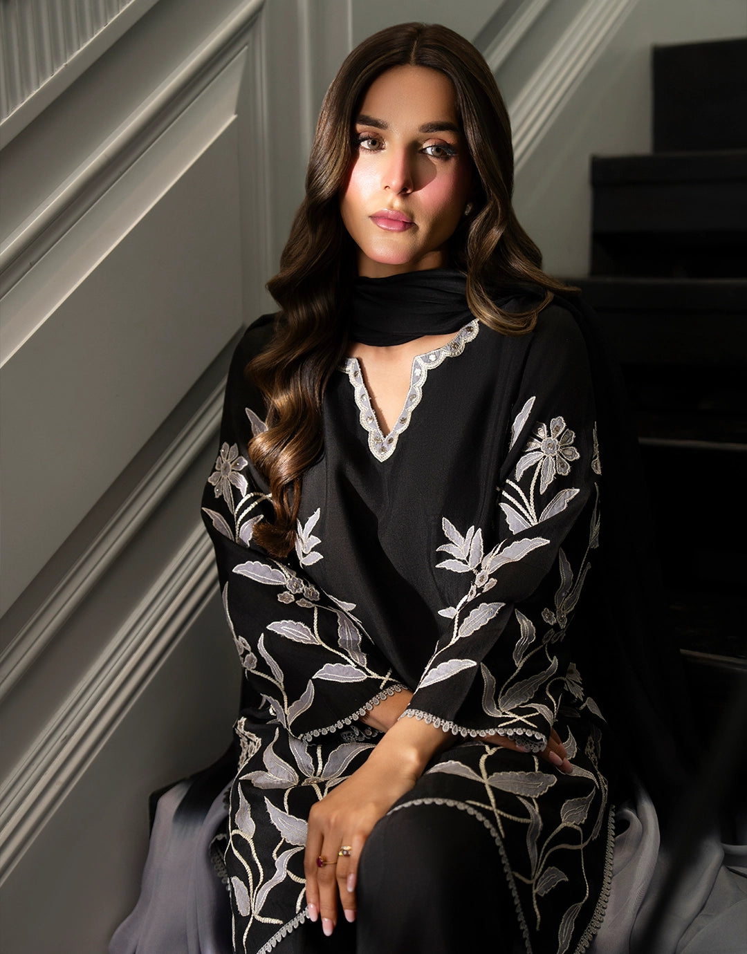 This sophisticated three-piece ensemble features a coordinated shirt and trouser set meticulously crafted from luxurious Khadi Silk. The outfit is elevated by intricate floral embroidery across the shirt and sleeves, beautifully complemented by a fluid medium silk dupatta. Its timeless black palette and refined lace detailing on the borders make it an exquisite choice for elegant evening wear.