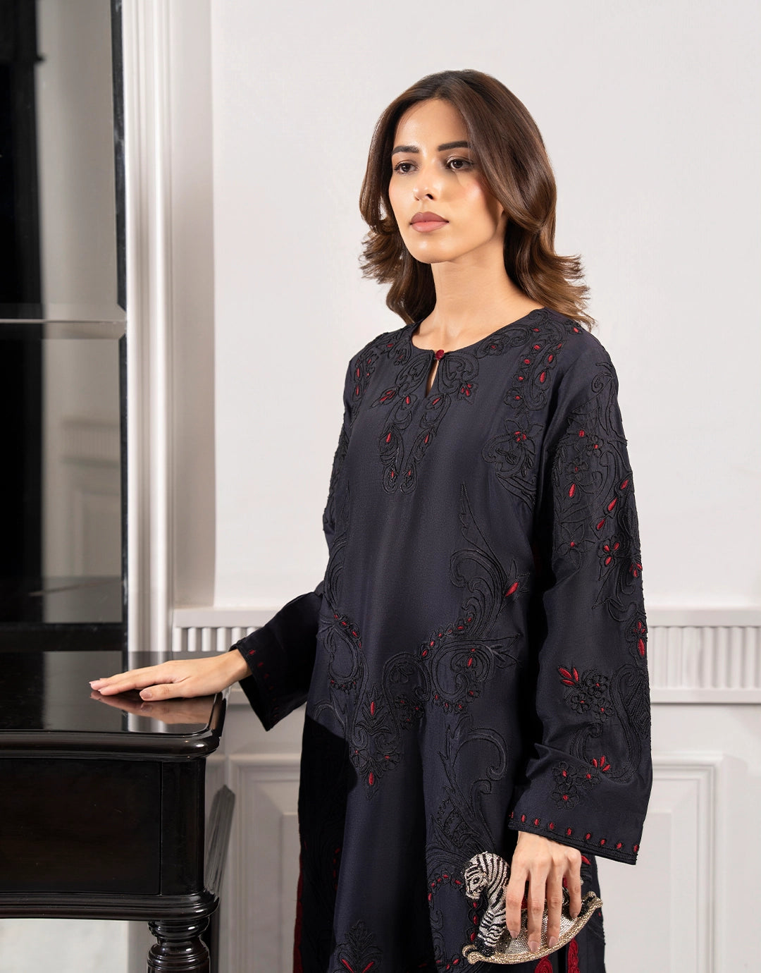 Indulge in pure elegance with this exquisite Pure Raw Silk shirt featuring meticulous, all-over tonal black embroidery. The long, sophisticated silhouette is accentuated by striking red ornamental trim along the side seams and hem. A must-have statement piece, perfect for making a refined impact at any evening or semi-formal event.