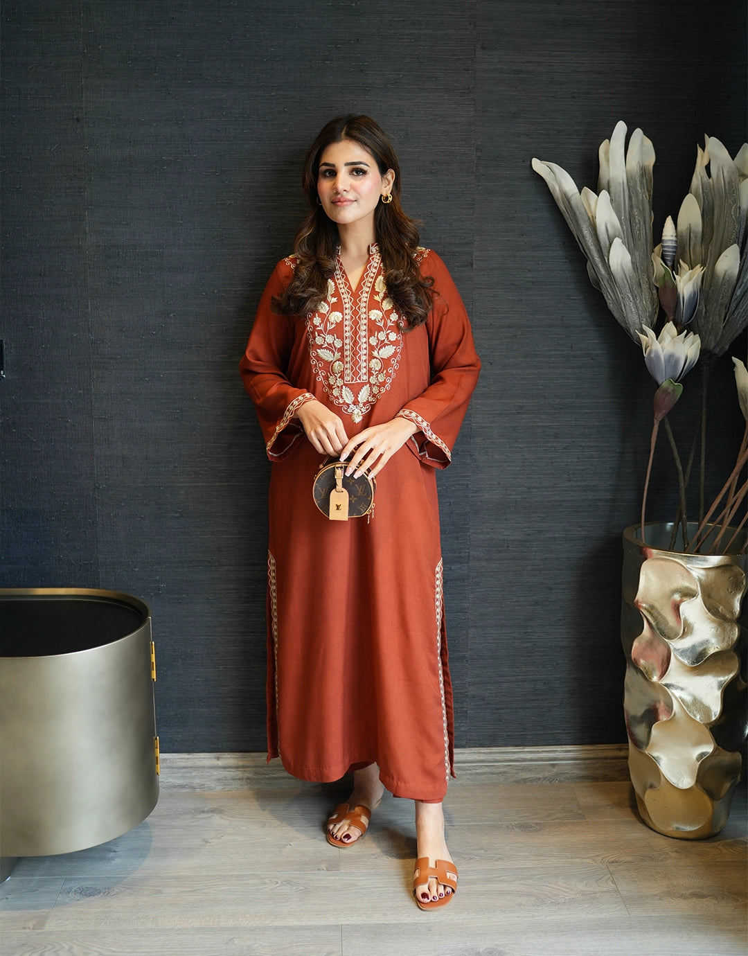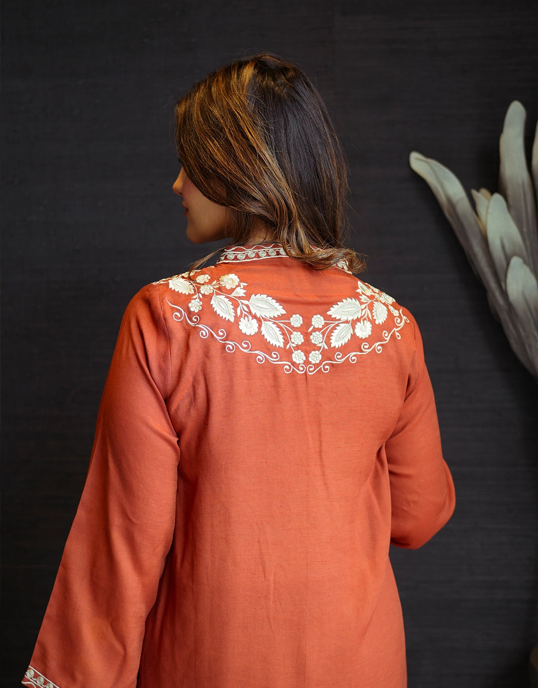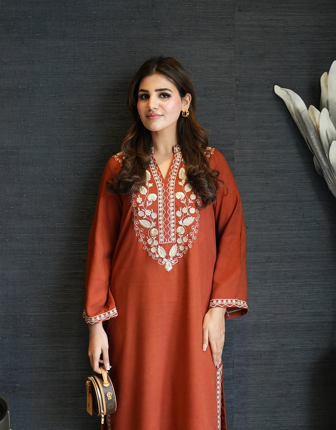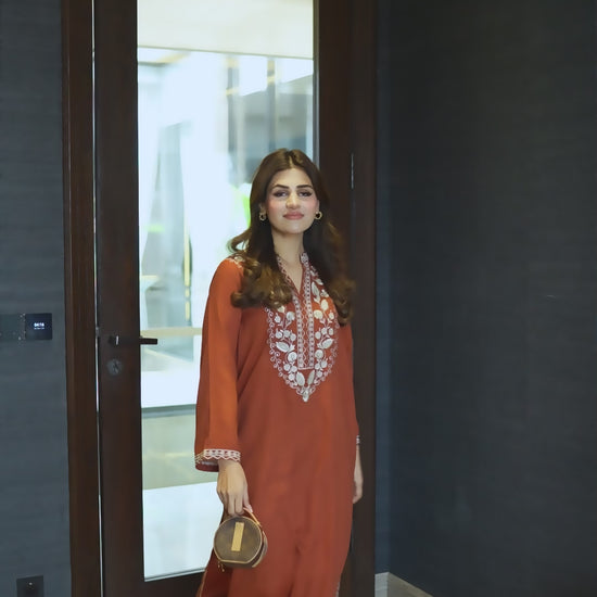 This sophisticated 2-piece set features a rich rust-toned base detailed with high-quality embroidery across the front and sleeves. Crafted from breathable khadi silk fabric, this outfit is designed for those who value all-day comfort without compromising on style. Paired with matching trousers, it provides a complete, ready-to-wear look that feels both modern and comfortable.