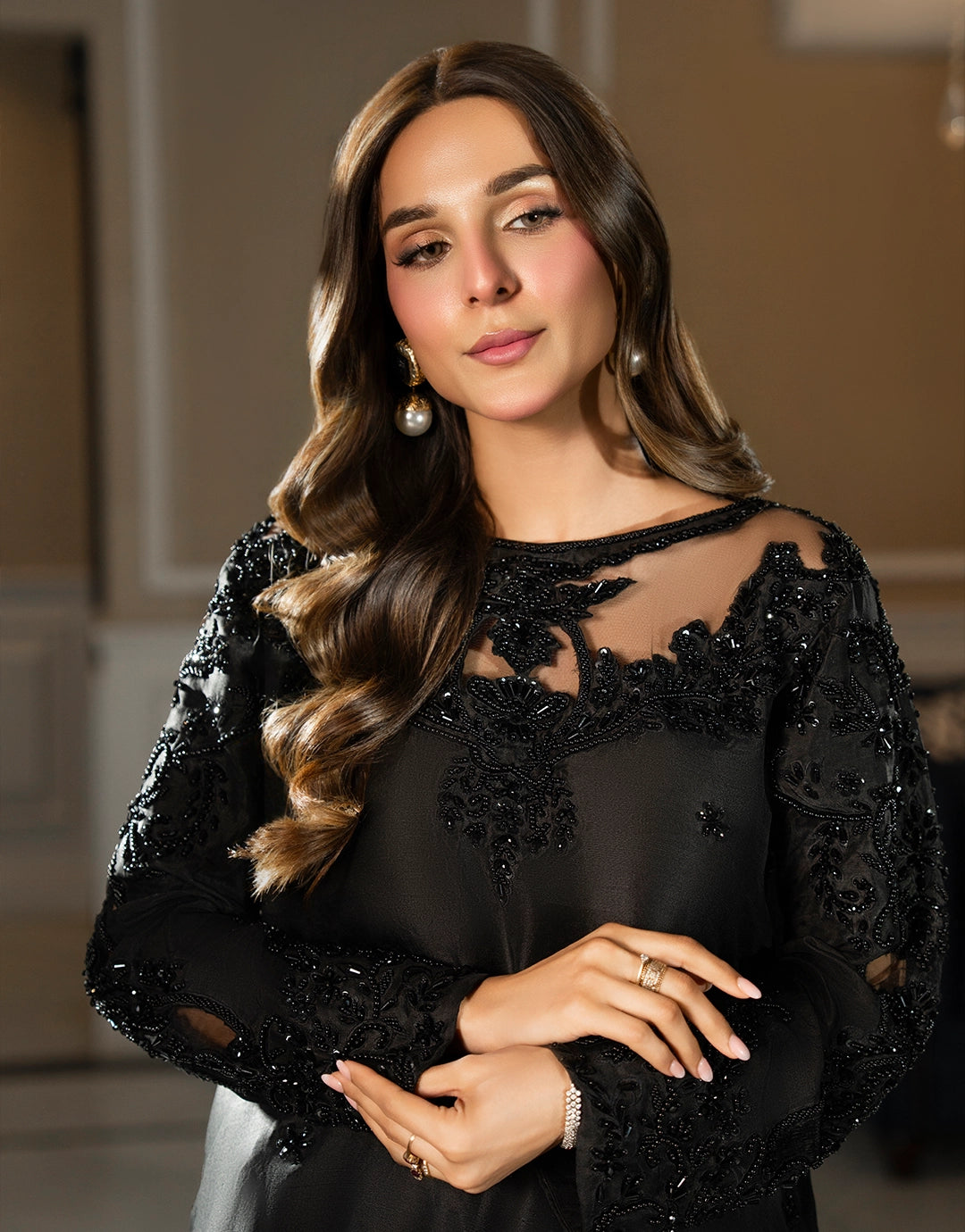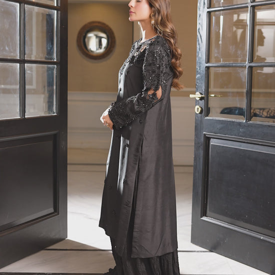 This masterpiece features a pure raw silk shirt meticulously adorned with fully hand-worked embroidery and intricate hand-embellished floral motifs. The ensemble is paired with a traditional crushed izaar, creating a high-fashion silhouette that balances rich texture with timeless style. Finished with delicate lace detailing and a flowing dupatta, this set represents the pinnacle of formal luxury and artisanal craftsmanship.