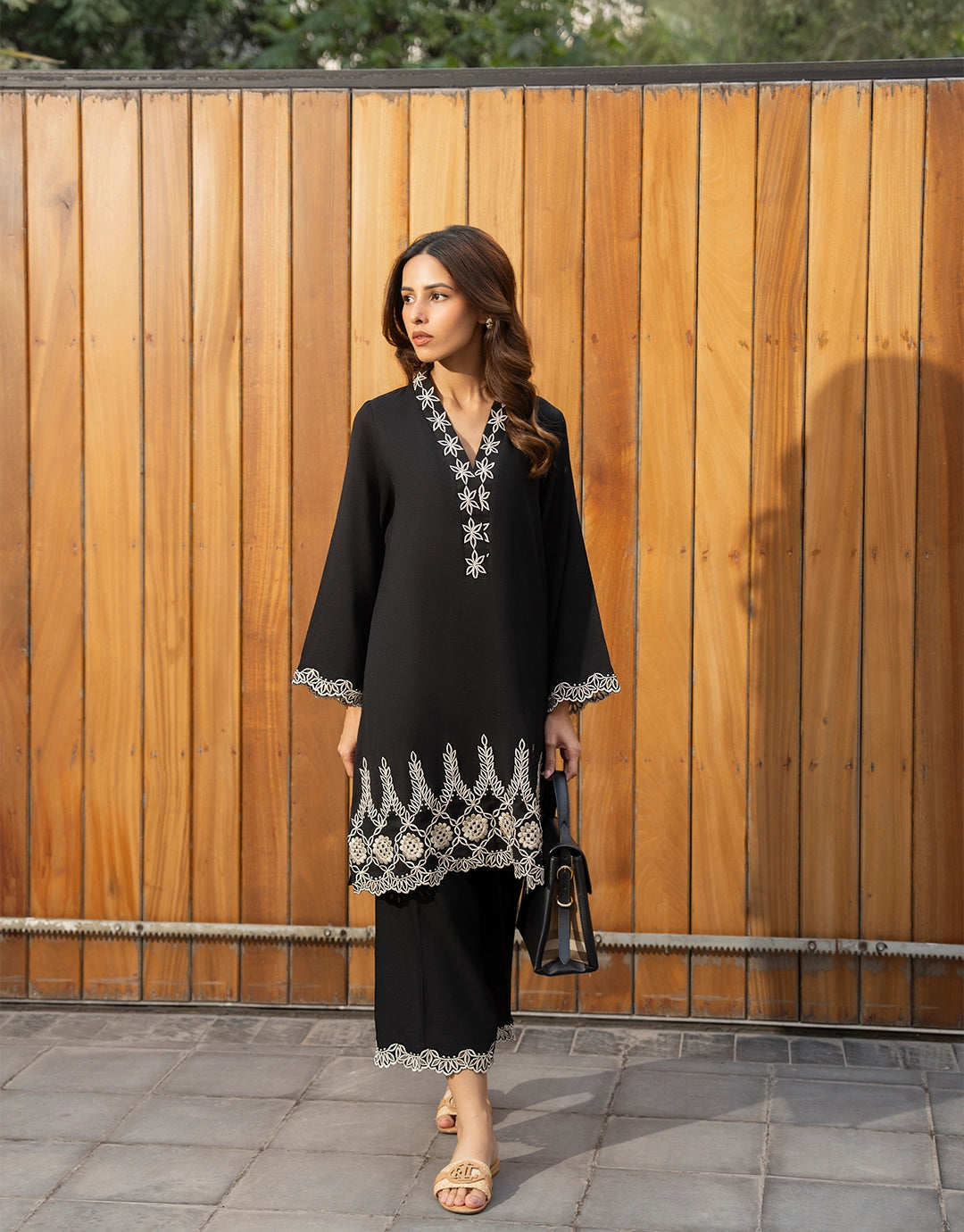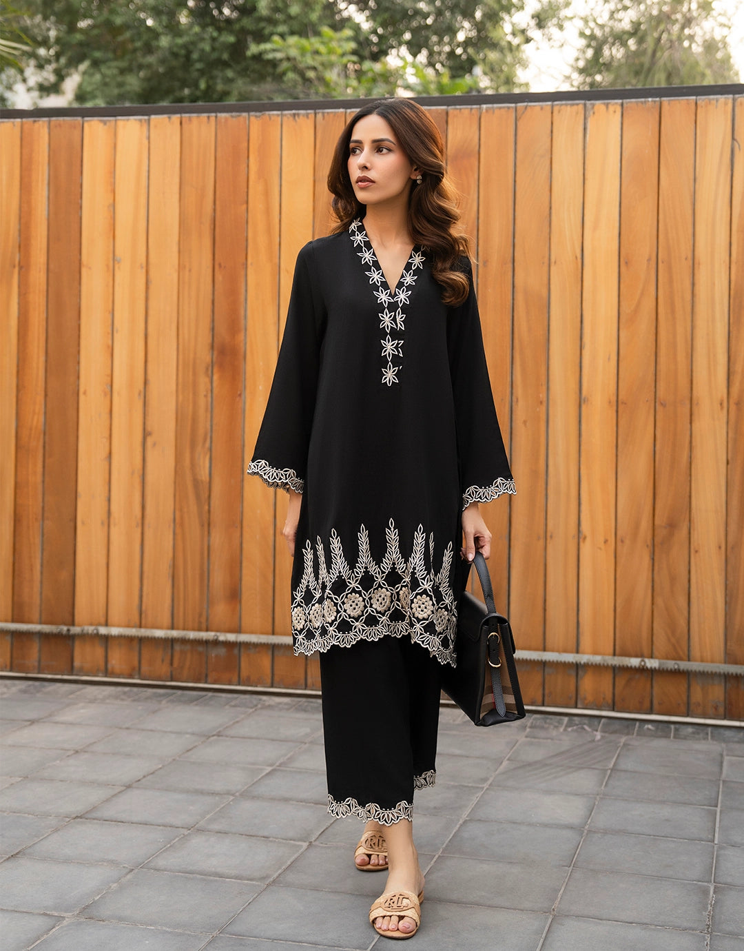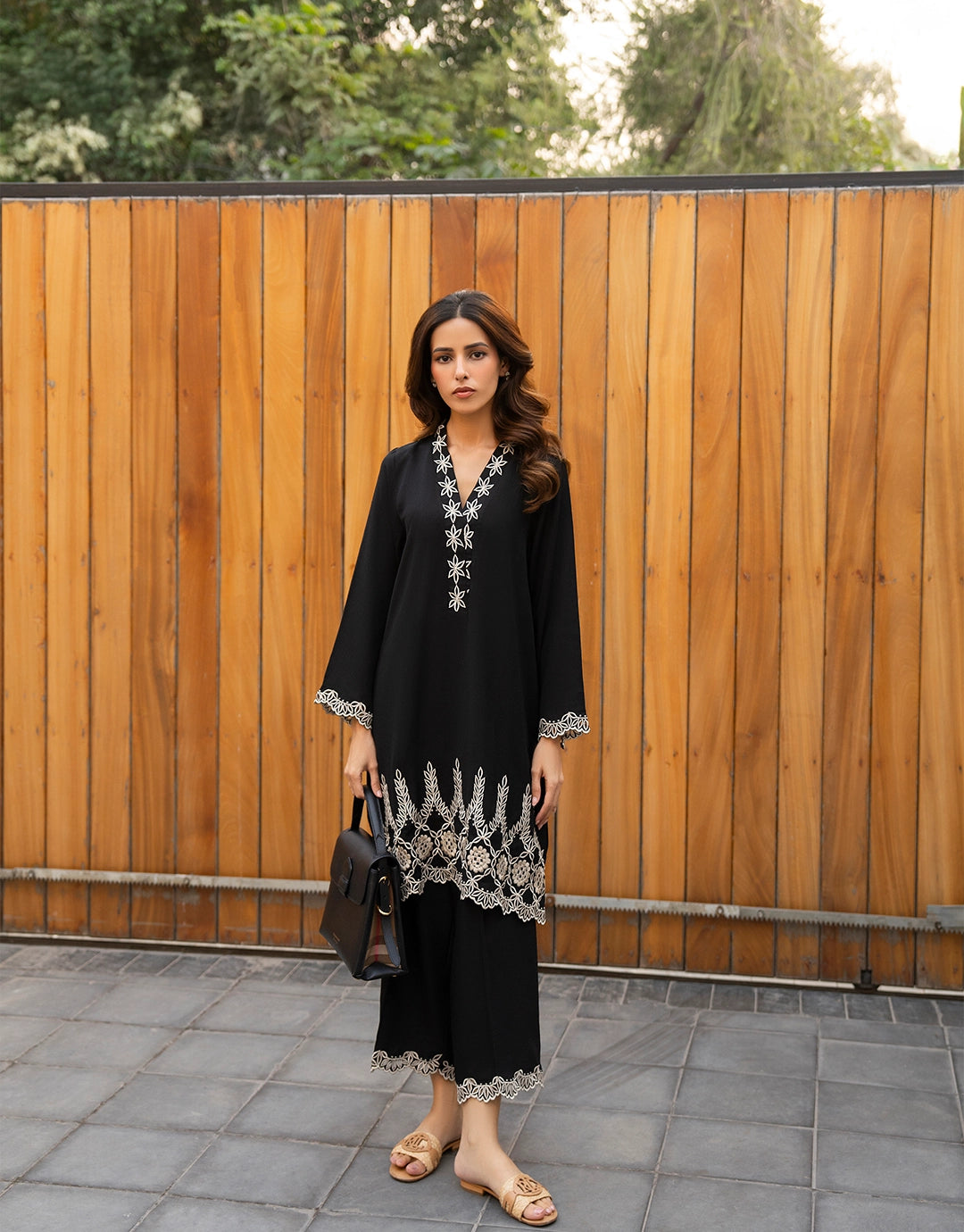 Embrace effortless elegance in this timeless Black Khaddar suit, perfect for smart casual or office wear. The chic two-piece design is enhanced by striking white embroidery along the hems and neckline, creating a sophisticated and versatile monochrome statement.