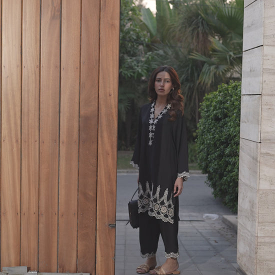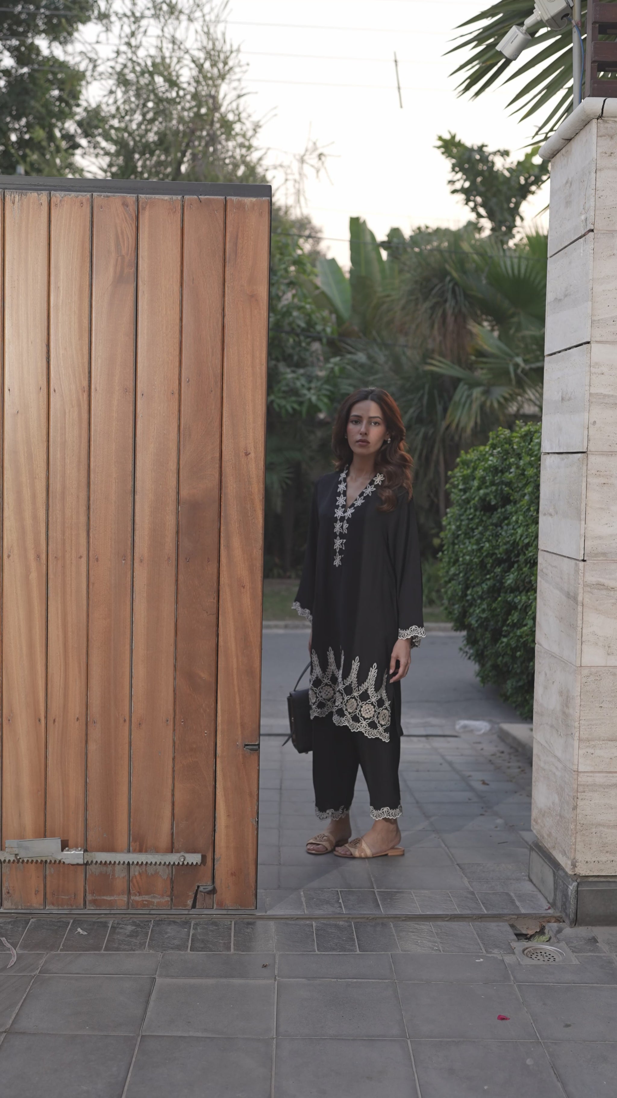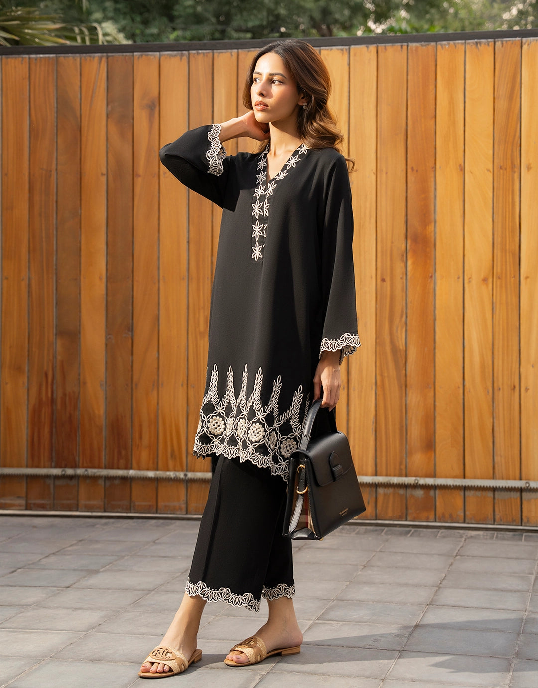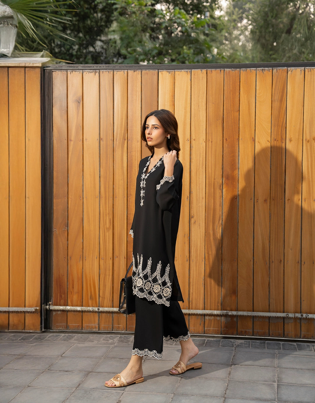Embrace effortless elegance in this timeless Black Khaddar suit, perfect for smart casual or office wear. The chic two-piece design is enhanced by striking white embroidery along the hems and neckline, creating a sophisticated and versatile monochrome statement.