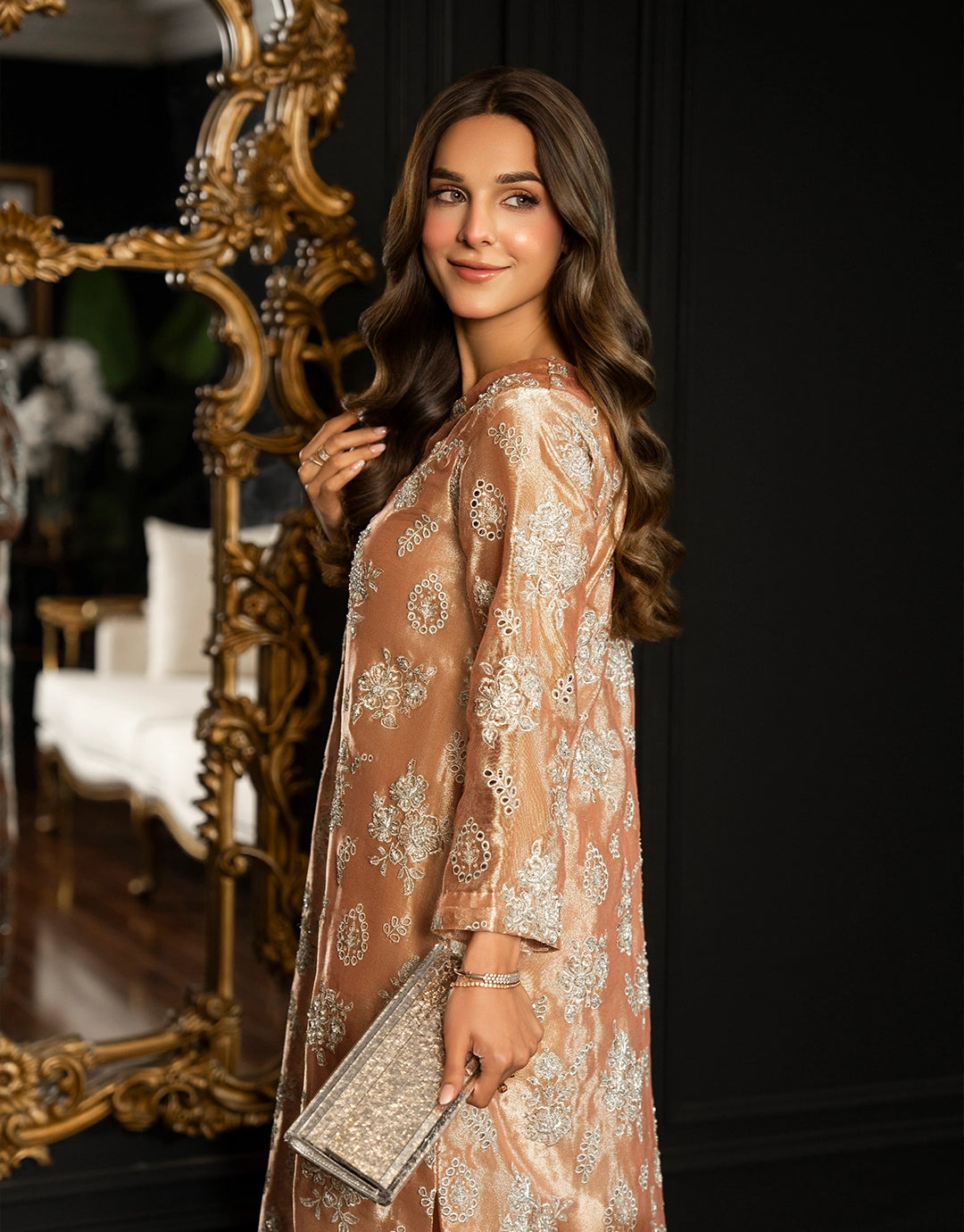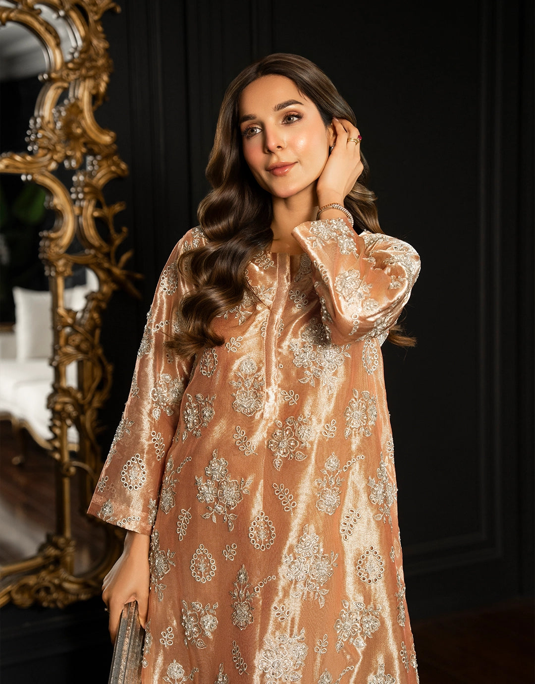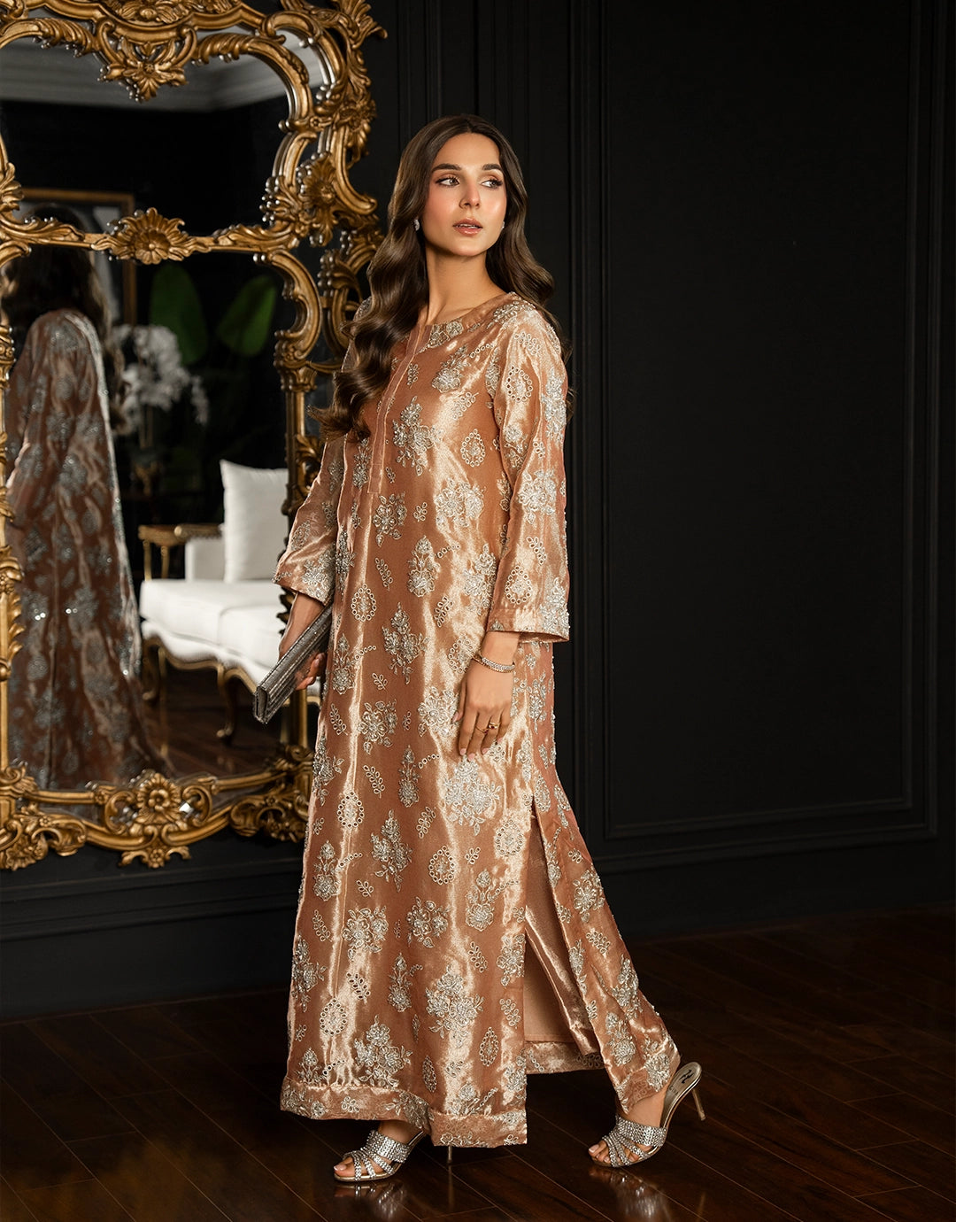 This stunning ensemble is meticulously crafted from pure tissue fabric, offering a luminous sheen and a high-end, ethereal silhouette. The shirt features a masterful blend of intricate embroidery and hand-embellished floral patterns that add a luxurious, three-dimensional texture. Finished with delicate lace accents and a coordinated trouser, this set is the epitome of sophisticated formal elegance.
