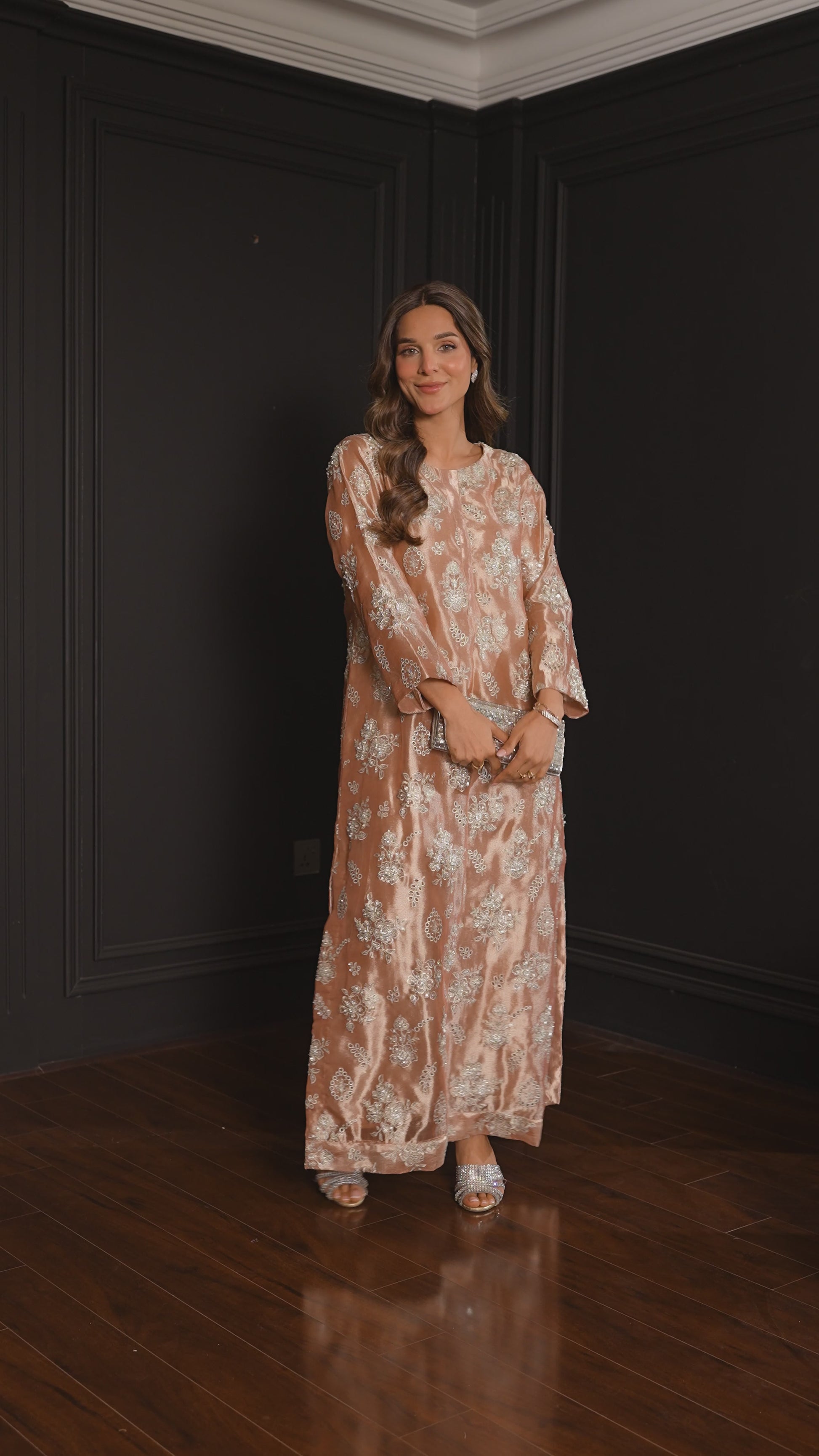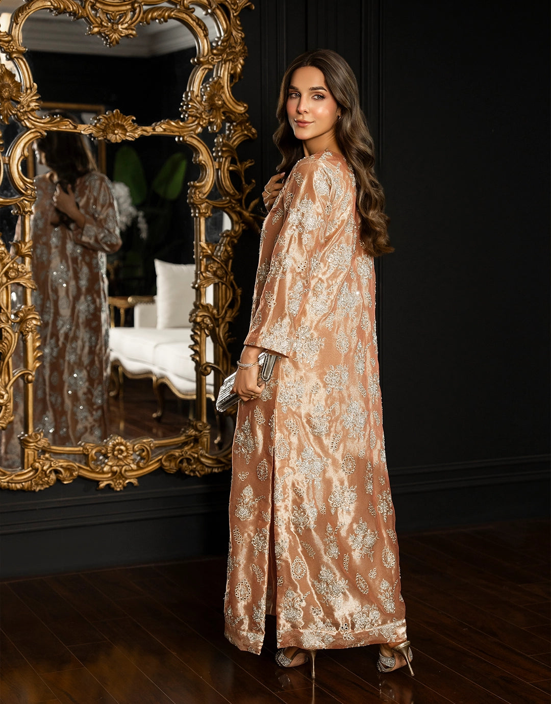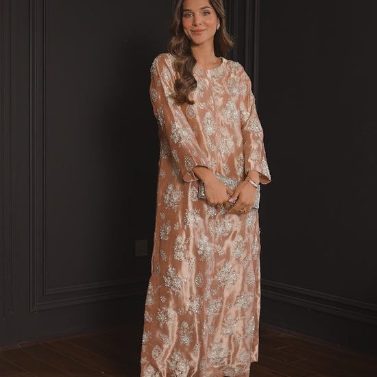 This stunning ensemble is meticulously crafted from pure tissue fabric, offering a luminous sheen and a high-end, ethereal silhouette. The shirt features a masterful blend of intricate embroidery and hand-embellished floral patterns that add a luxurious, three-dimensional texture. Finished with delicate lace accents and a coordinated trouser, this set is the epitome of sophisticated formal elegance.