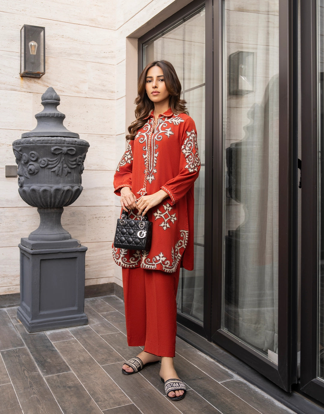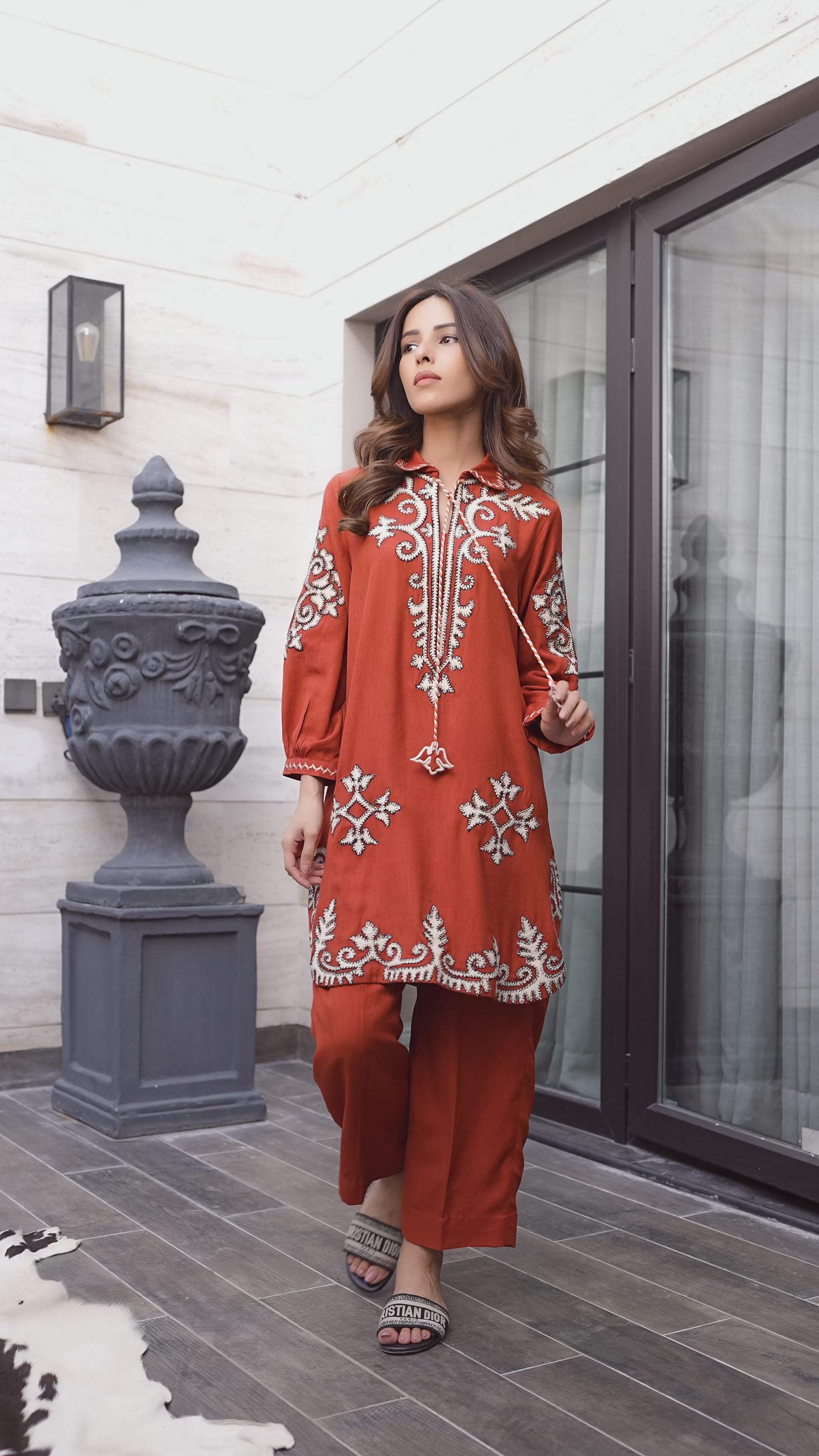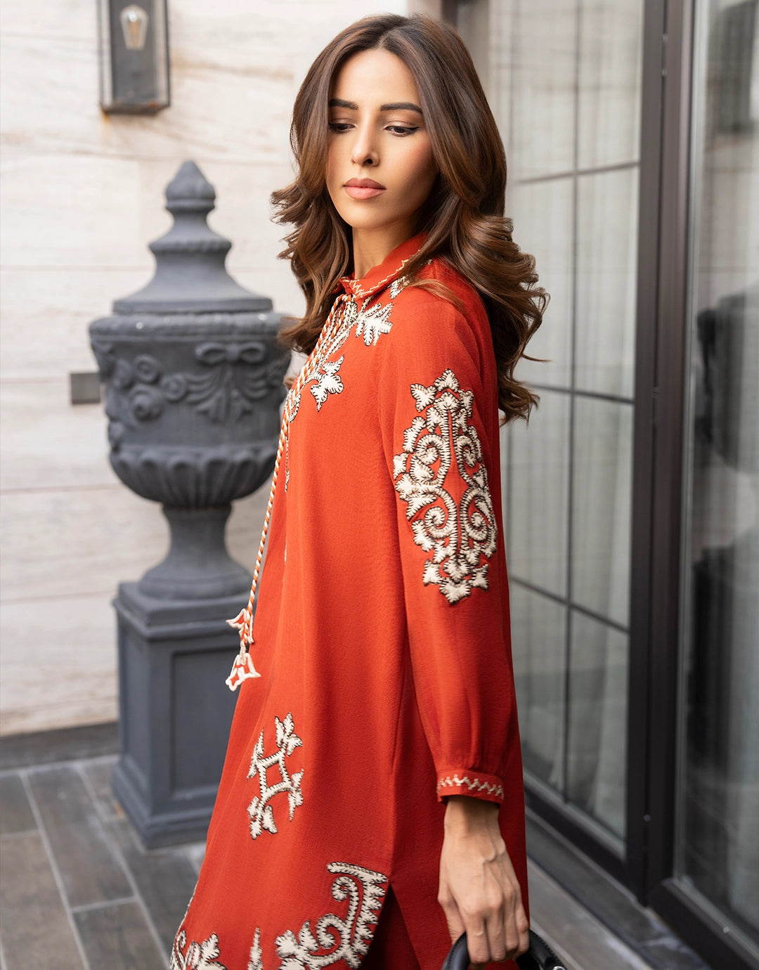 Made from a comfortable Cotton Linen Blend, this striking burnt-orange ensemble is richly detailed with contrasting white Embroidery. The intricate stitchwork across the bodice, sleeves, and hemline makes this the ideal sophisticated piece for elevated daytime wear or seasonal festivities.
