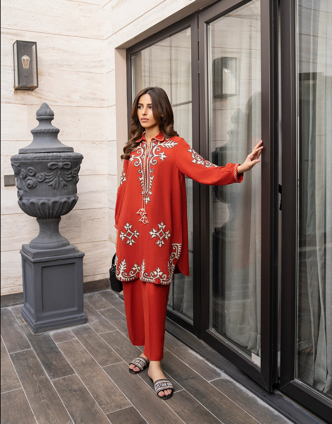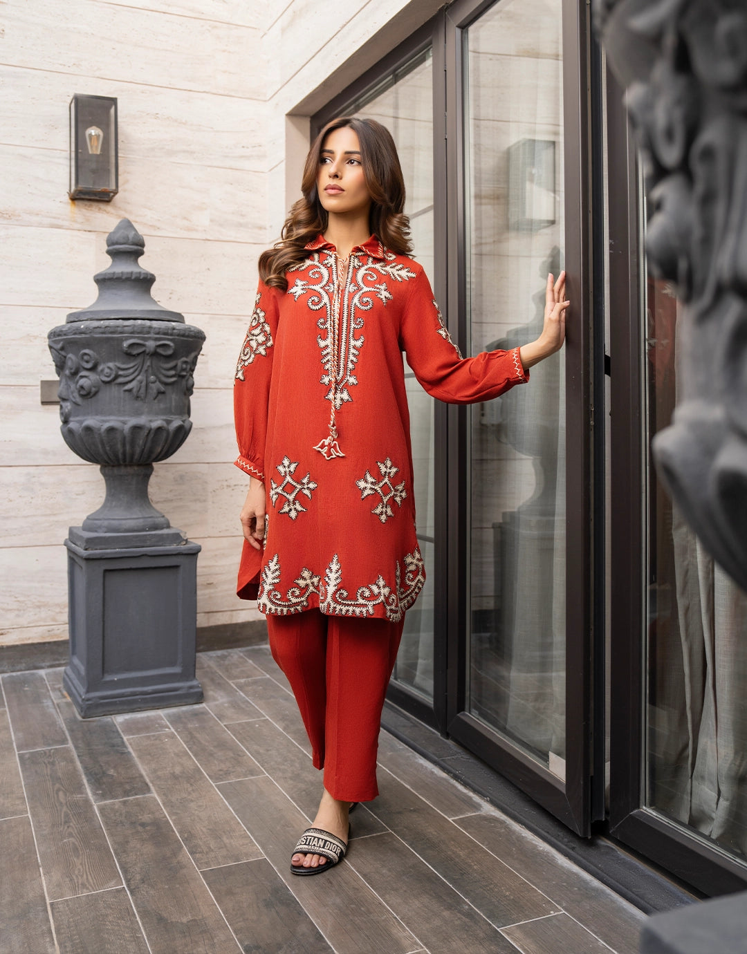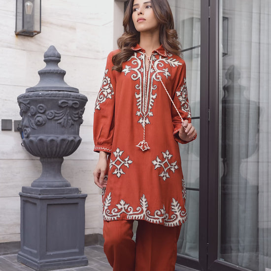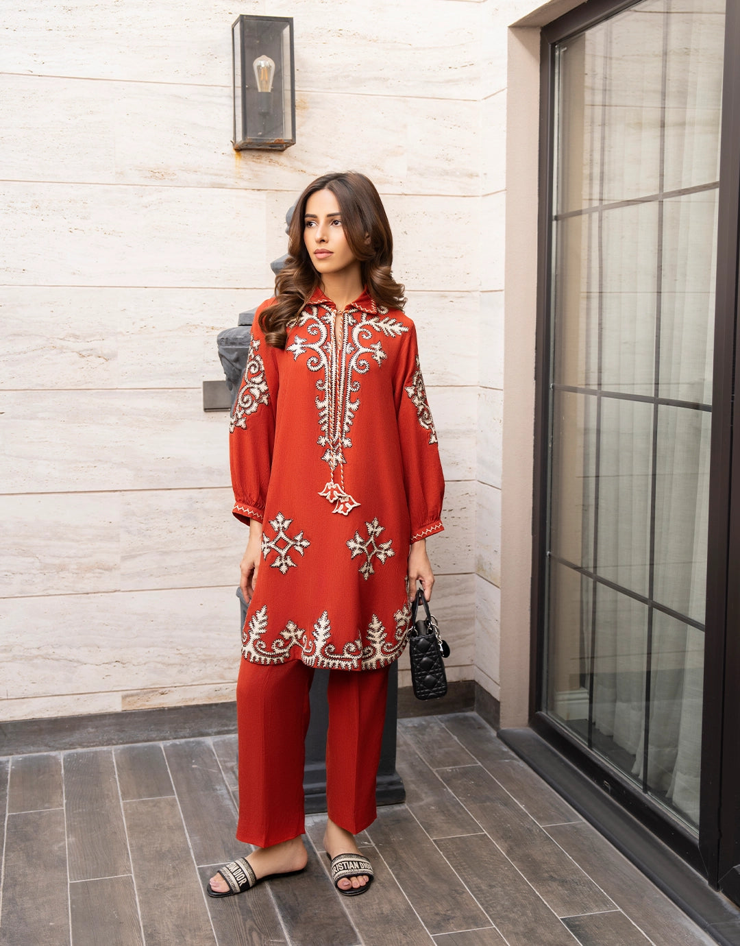 Made from a comfortable Cotton Linen Blend, this striking burnt-orange ensemble is richly detailed with contrasting white Embroidery. The intricate stitchwork across the bodice, sleeves, and hemline makes this the ideal sophisticated piece for elevated daytime wear or seasonal festivities.