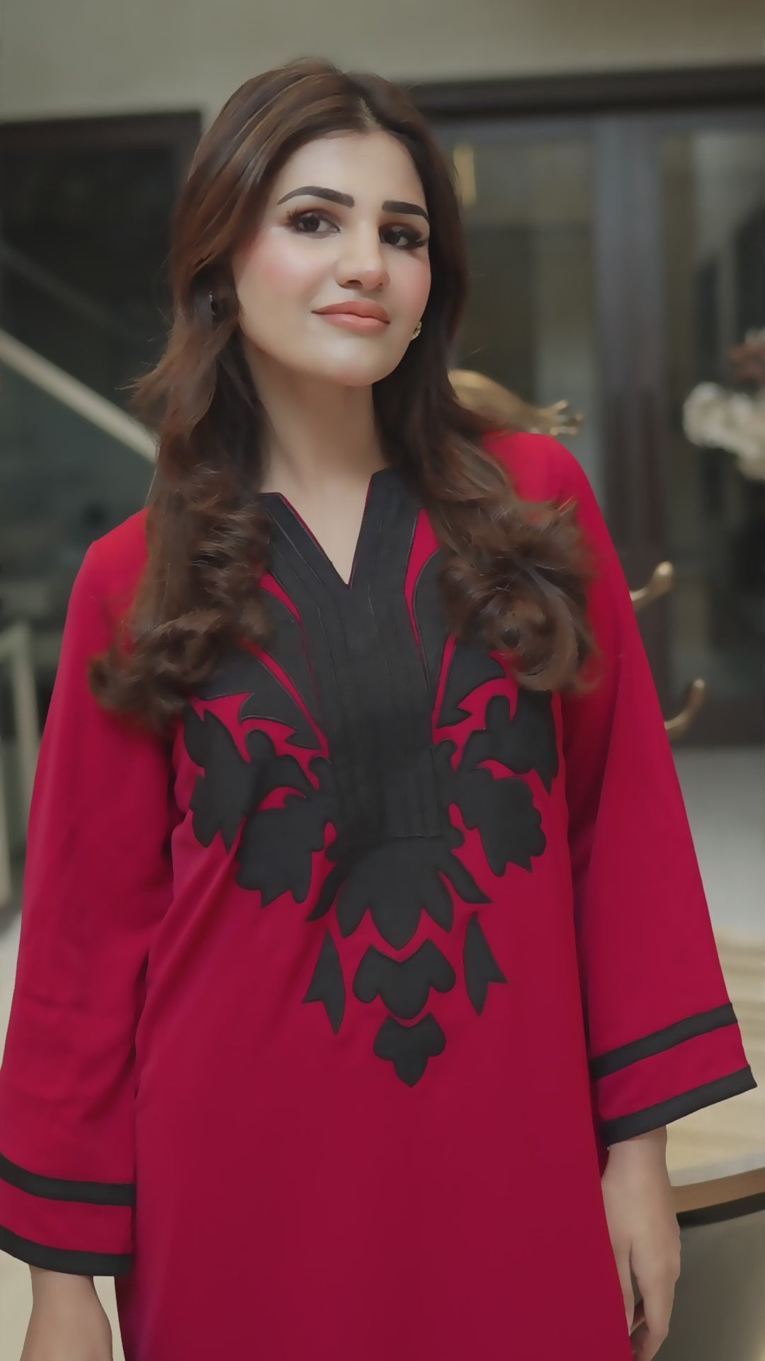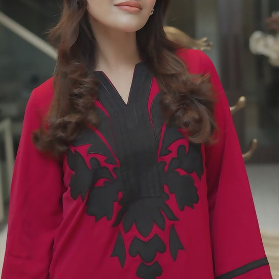 This vibrant 2-piece set features a bold black embroidered design that creates a modern, high-contrast look across the neck and cuffs. Both the long-cut shirt and matching trousers are made from premium matte twill, a breathable fabric that ensures a structured yet comfortable drape suitable for any season.